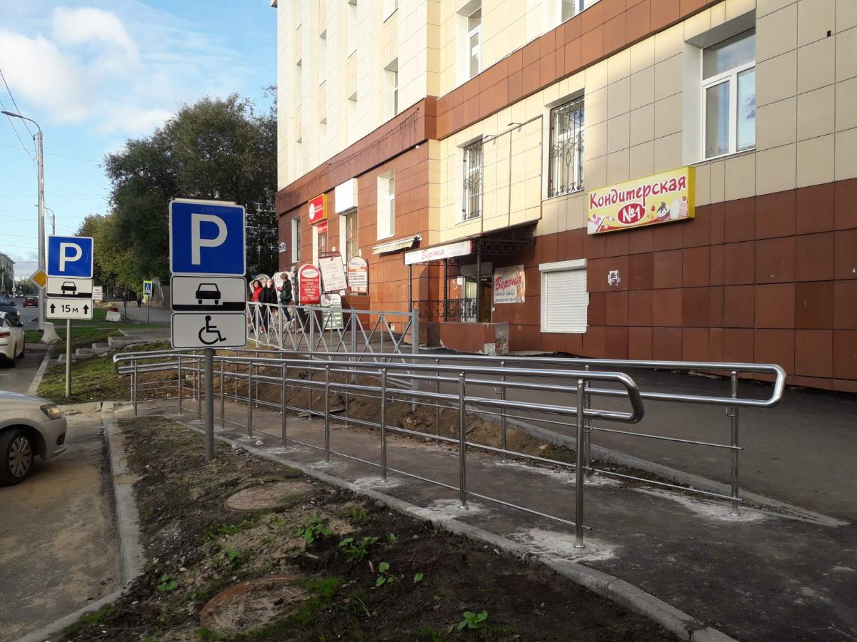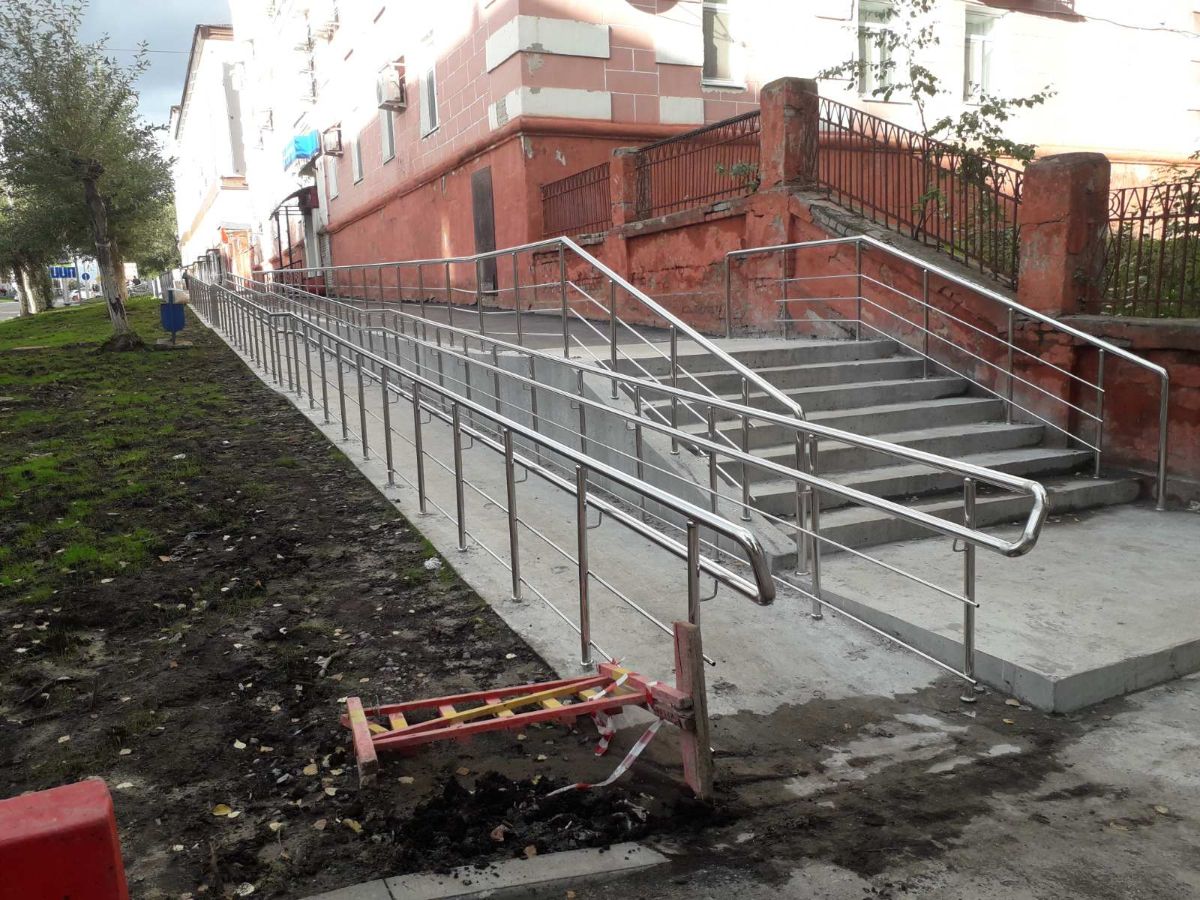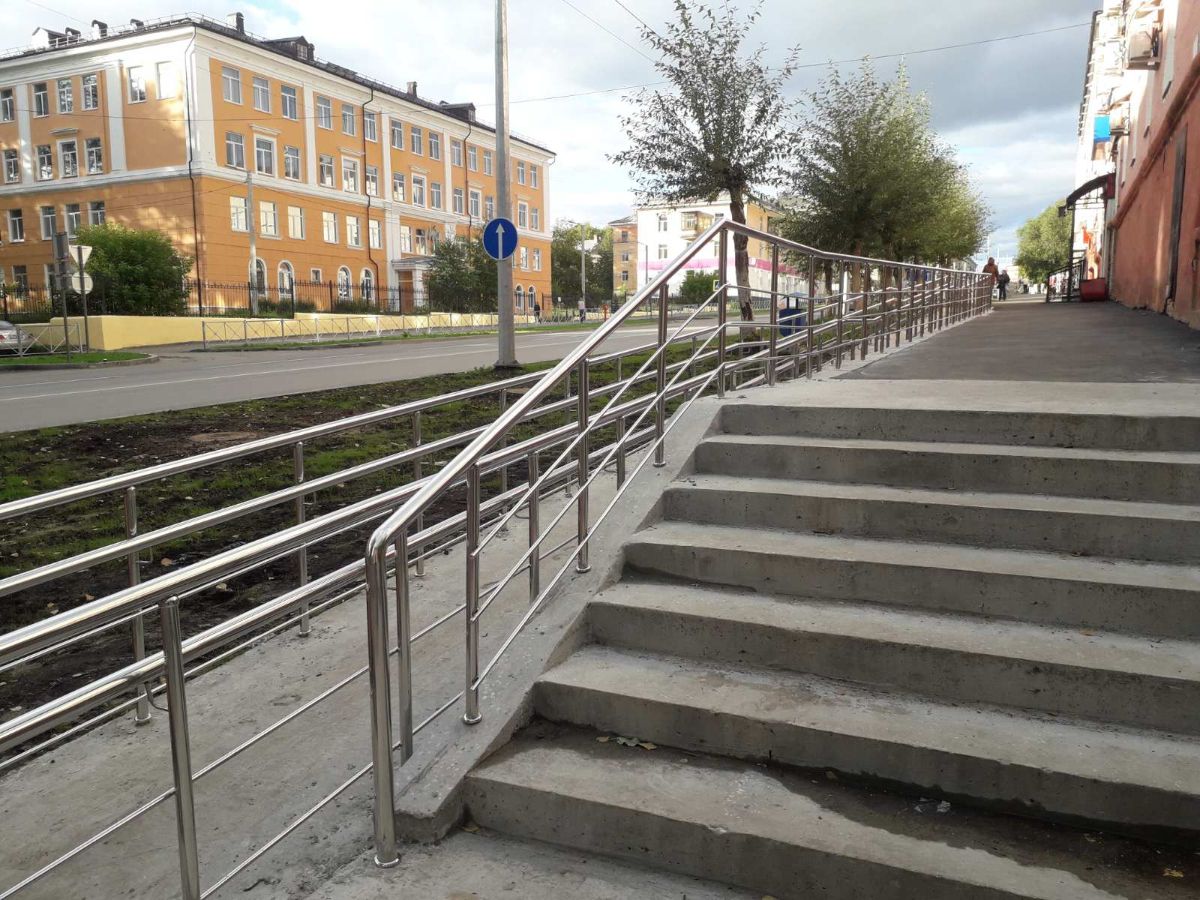 Наша компания предлагает полный спектр услуг: от проектирования до изготовления и установки перил из нержавеющей стали. Установка осуществляется в любом городе Пермского края. На данном объекте установлены перила на лестнице, ограждения на пандусе для инвалидов и мамочек с колясками, поручни на спуске. Перила и поручни выполнены из нержавеющей стали марки AISI 304.